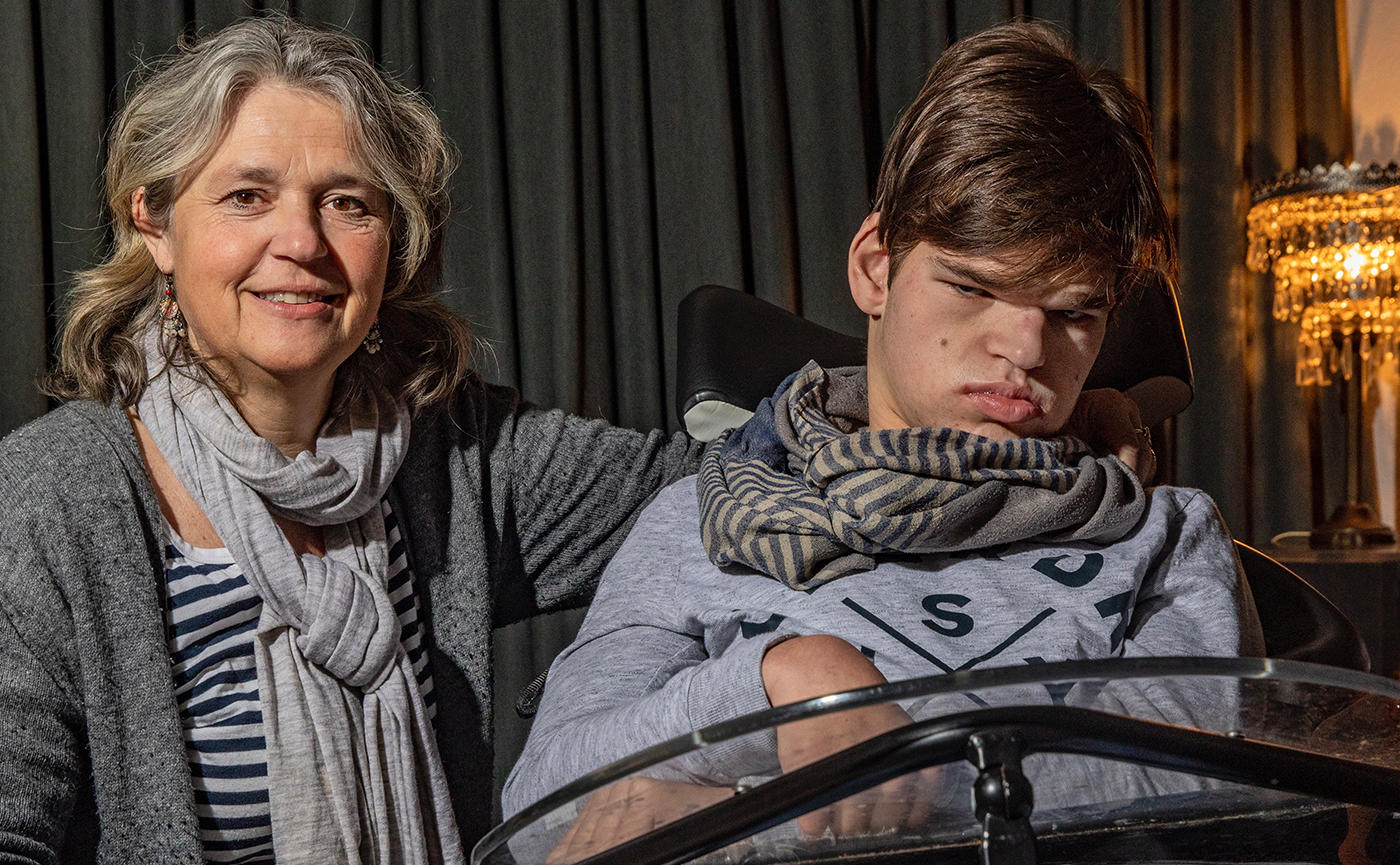 Sarike’s zoon Bram is bijna 25 jaar. Toen hij 6 jaar was, werd gezegd dat de familie beter afscheid van hem kon nemen. Hij zou niet oud worden. ‘Mijn man en ik hebben hem voornamelijk thuis verzorgd. En dat is niet ongewoon: een steeds groter deel van de kinderen met een ZEVMB of andere complexe zorgvragen, wonen thuis. In een instelling is het moeilijk om voldoende bezetting te realiseren op deze groepen, en ze werkelijk het leven te laten ervaren. Ook is het vaak niet mogelijk de dagelijkse medische zorg te bieden die wel nodig is. Hulp en zorg thuis voor Bram is moeilijk te vinden, en in het ziekenhuis schrikken zorgmedewerkers als ze hem zien.’ Daarom maakte Sarike een eigen campagneposter ‘Ongeneeslijk. Niet uitbehandeld.’ met een foto van Bram, en plaatste die op LinkedIn. ‘Want ook voor hem is geen behandeling. Dat was mijn doel met de poster. Een heel gezin wordt niet gezien.’