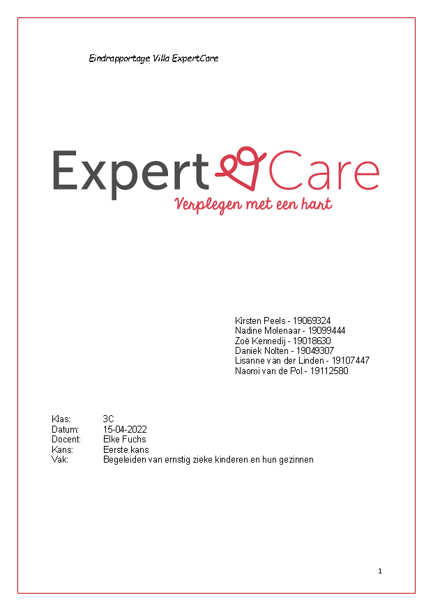 Authors: Kirsten Peels, Nadine Molenaar, Zoë Kennedij, Daniek Nolten, Lisanne van der Linden, Naomi van de Pol Educational institution: The Hague University of Applied Sciences Client: Villa Expertcare