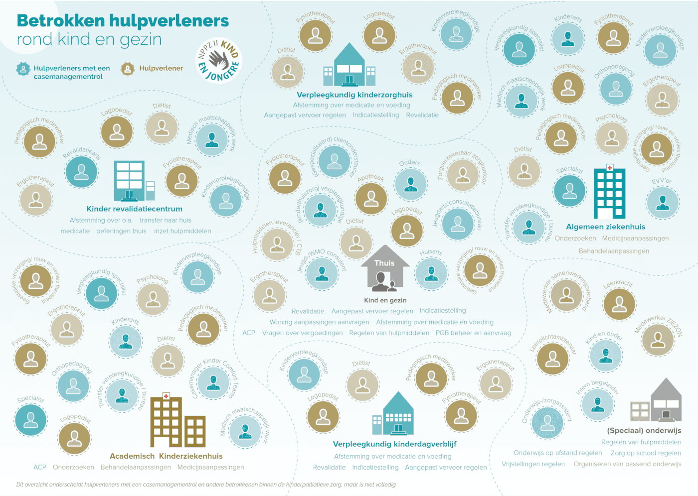 Bij een gezin met een ernstig ziek kind zijn vaak tientallen zorgverleners betrokken. Onderstaande afbeelding maakt dit inzichtelijk. Ook maakt deze afbeelding inzichtelijk welke van de betrokken (zorg)professionals nu al een deel van de taken rond casemanagement in hun takenpakket hebben.