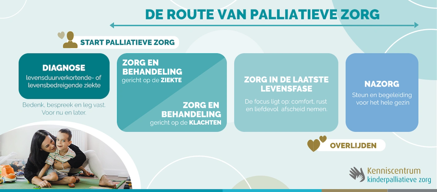 Het is fijn als er aandacht is voor palliatieve zorg vanaf het moment dat bekend is om welke ziekte of aandoening het gaat. Deze zorg kan weken, maanden, of jaren duren. Naarmate de palliatieve fase vordert zal de behandeling zich meer gaan richten op de klachten die je kind heeft door de ziekte, in plaats van op de ziekte zelf. Centraal staat de verlichting van de klachten en de kwaliteit van leven. De laatste levensfase wordt ook wel de palliatief terminale fase genoemd. Deze fase kan weken of maanden duren. Ook kan het zijn dat je kind tijdelijk herstelt. Het allerlaatste deel van het leven heet de stervensfase. Dit is de fase die direct voorafgaat aan het overlijden. Vaak treden er dan lichamelijke en geestelijke veranderingen op. De afbeelding hieronder laat deze fases van palliatieve zorg zien.