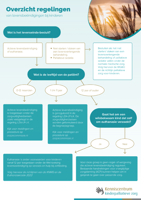 • In Nederland zijn er verschillende regels voor late zwangerschapsafbreking, levensbeëindiging bij pasgeborenen en kinderen 1-12 jaar, en euthanasie bij wilsbekwame kinderen vanaf 12 jaar.• Levensbeëindiging mag alleen worden uitgevoerd als aan de zorgvuldigheidseisen wordt voldaan. Deze staan in de regelingen beschreven.